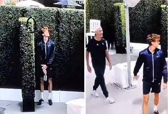 L’azzurro si apposta dietro una colonna in attesa probabilmente di saltar fuori al passaggio dell’allenatore australiano. Il piano del numero 1 del mondo, però, naufraga miseramente. Cahill si accorge del maldestro tentativo, niente blitz. Sinner rimandato come giocatore di nascondino.